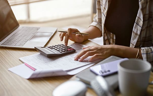 A photo of a person sitting at a desk, typing into a calculator. The photo is focused on the person's hands.