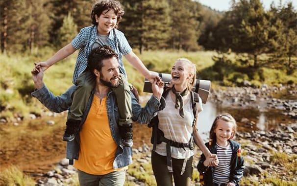 A family of four is walking outside. The father has one child riding on his shoulders, the other child is next to the mom, holding her hand. The family looks to be happy and having fun