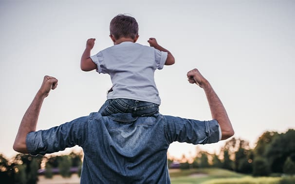 Photo taken from behind and a father has his young soon sitting on his shoulders. Both of them have their arms flexed in a body builder pose