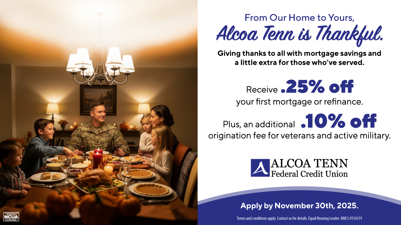 November is a month of giving thanks, especially to our veterans. That's why starting November 1 - November 30, 2025, when a new application is recieved, we're offering a .25% discount off qualified rate for first mortgage purchase or first mortgage refinance. And, for veterans and active military, we're adding a .10% discount off the origination fee. Offer available on new money only. Must be primary residence. Apply online or contact the mortgage department today!
